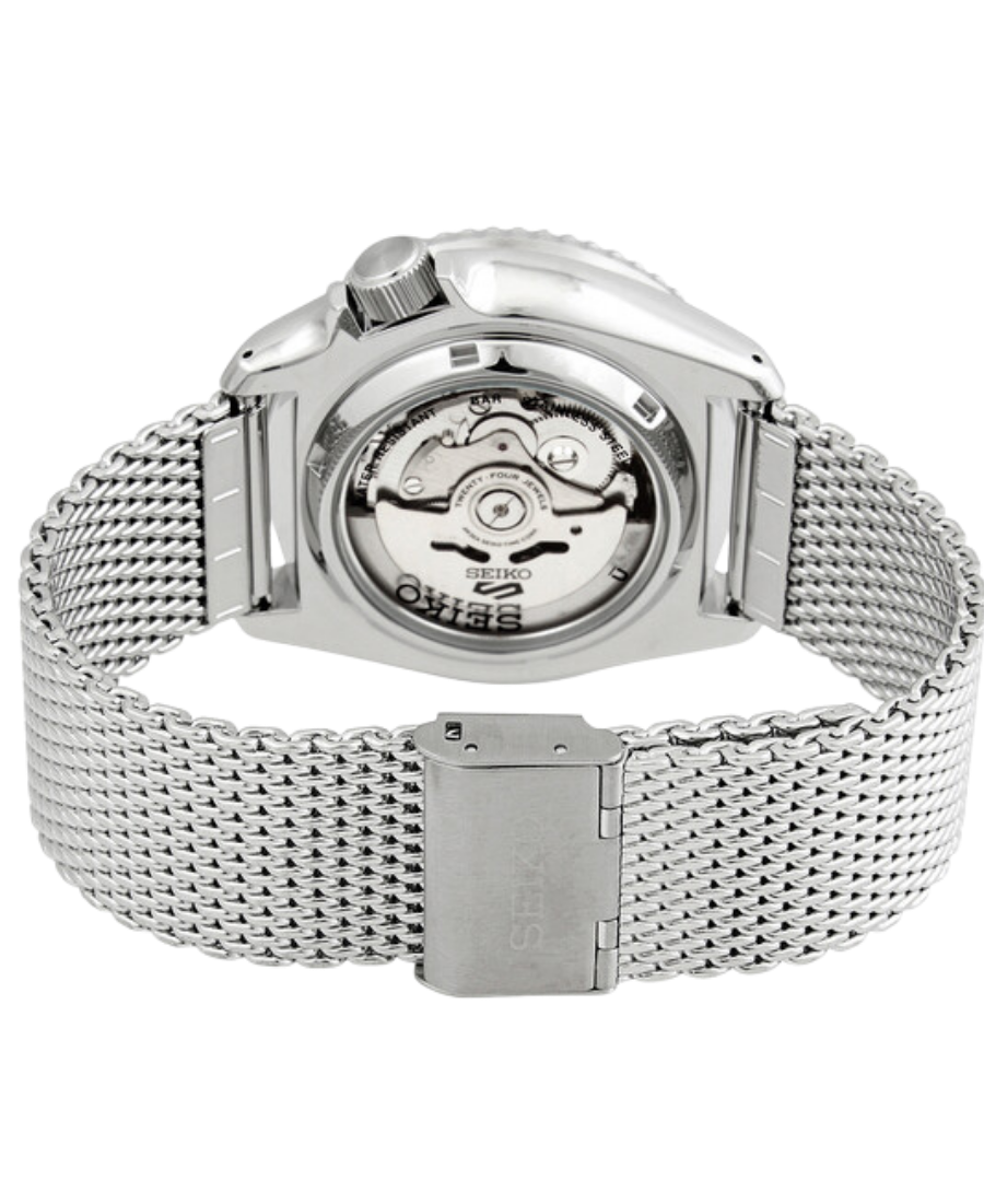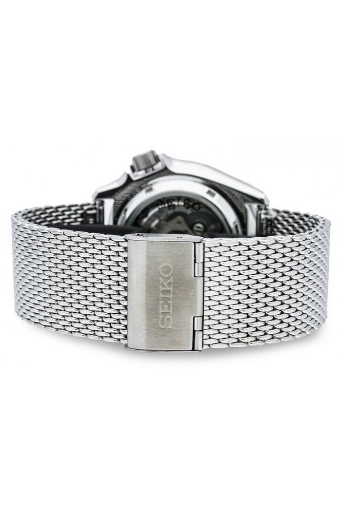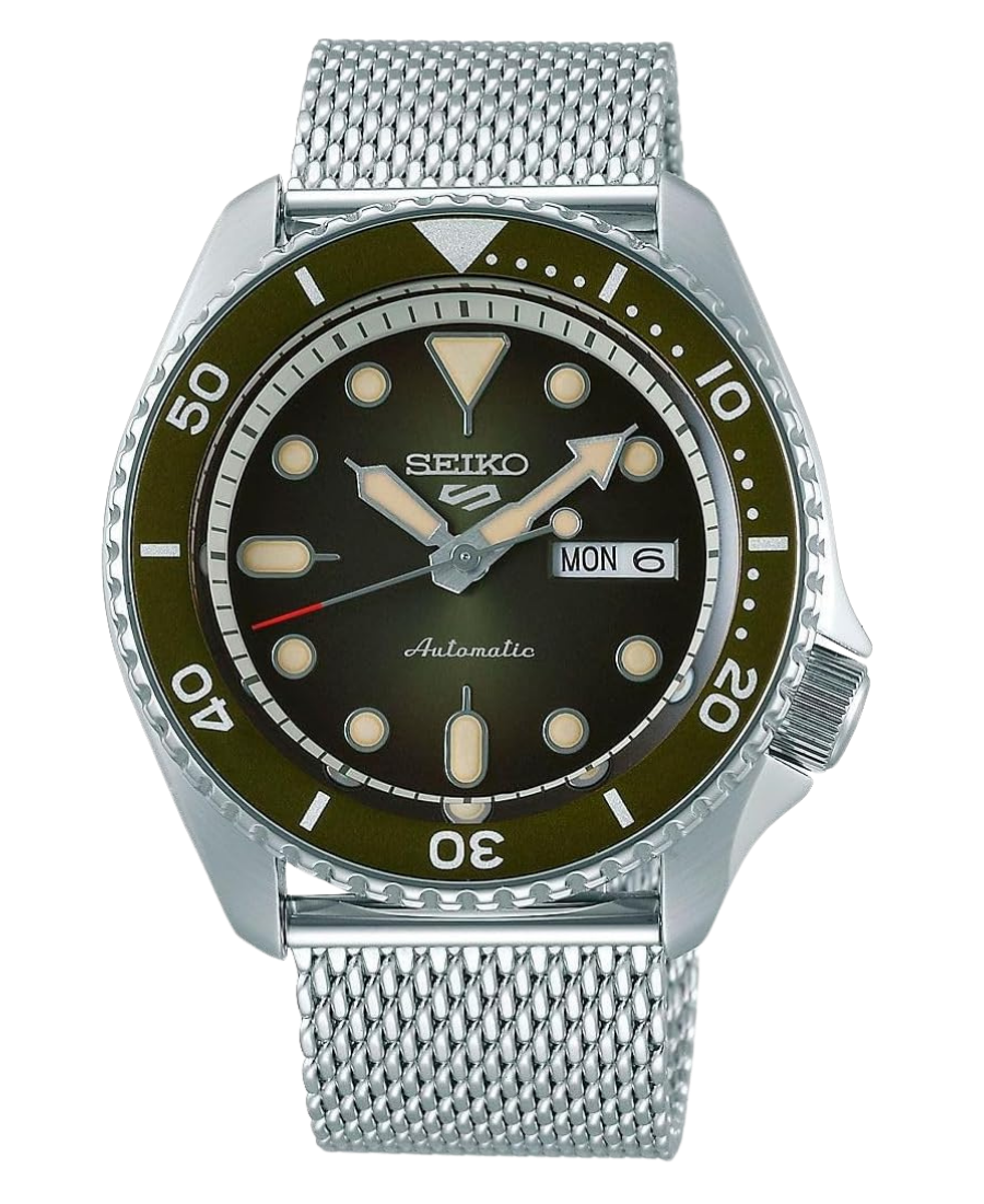 Seiko SRPD75K1 är en sportig och elegant automatisk klocka med grön urtavla och mesharmband, perfekt för både vardag och stilren casual look.