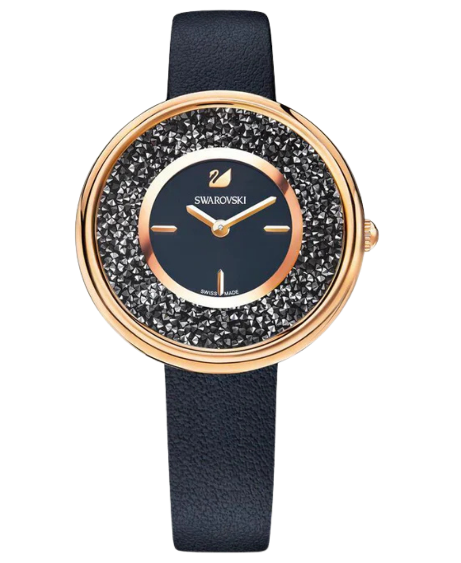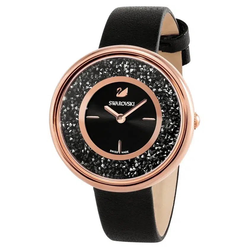 Swarovski 5275043 är en elegant damklocka med svart sunray-urtavla och svart italienskt läderarmband, med glänsande kristaller runt boetten och polerade roséguldfärgade visare för en sofistikerad och feminin look.