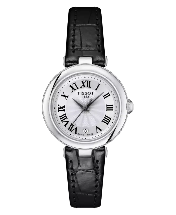 Tissot Bellissima är en elegant damklocka i 316L rostfritt stål med silverfärgad urtavla och klassiska romerska siffror. Klockan har en slimmad boett på 26 mm, svart läderarmband i alligatorprägling, reptåligt safirglas och schweiziskt kvartsurverk med datumvisning. En tidlös dressklocka från Tissot med 5 ATM vattenskydd, perfekt för både vardag och fest.