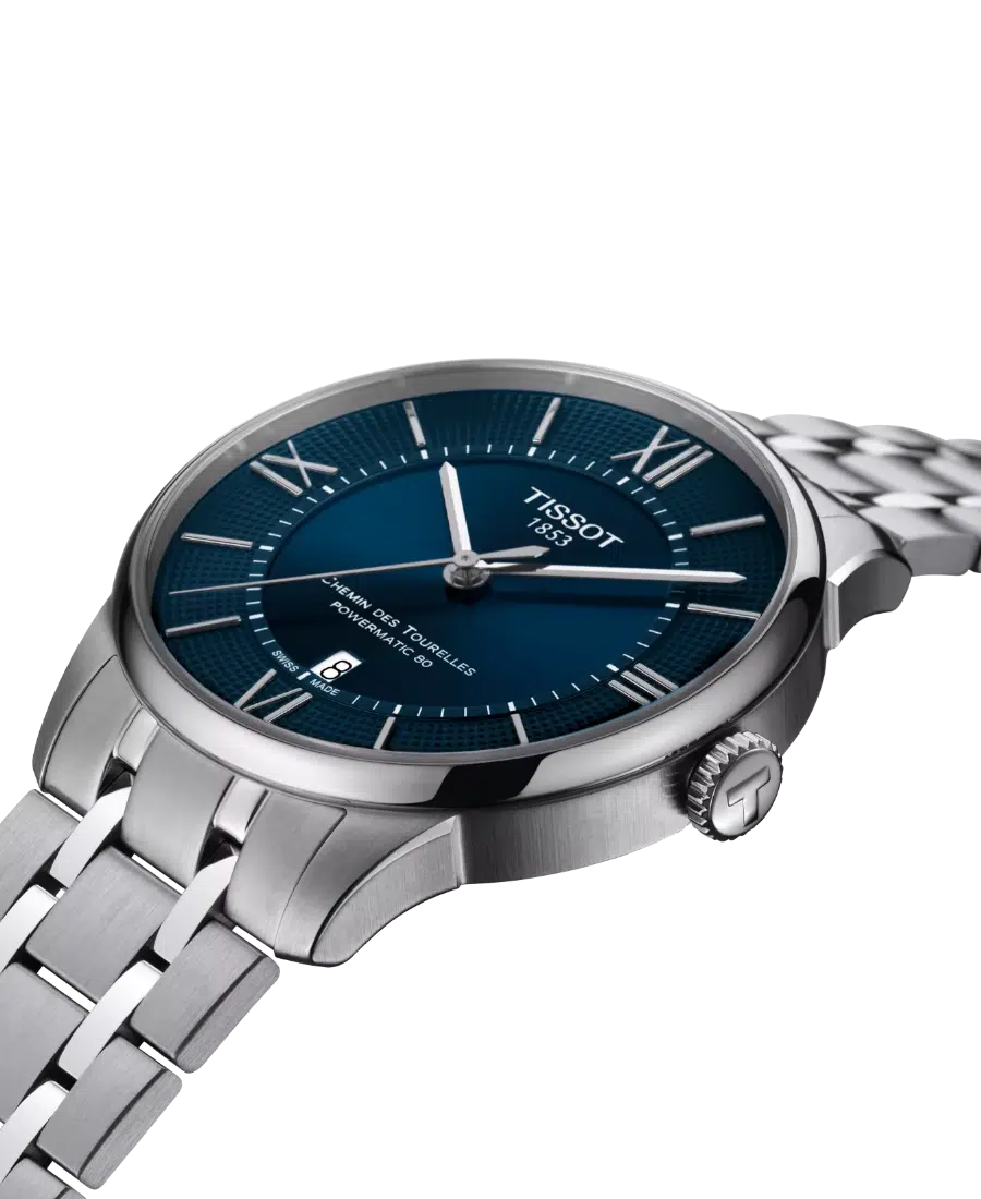Elegant herrklocka från Tissot Chemin des Tourelles-serien med 42 mm boett i borstat och polerat 316L rostfritt stål, blå urtavla med romerska siffror och indexmarkeringar samt transparent bakboett som visar det schweiziska Powermatic 80-verket. Klockan har safirglas med antireflexbehandling, datumvisning vid kl. 6, upp till 80 timmars gångreserv och robust stållänk med viklås. Vattenskyddad till 5 ATM – perfekt som vardags- och dressklocka.