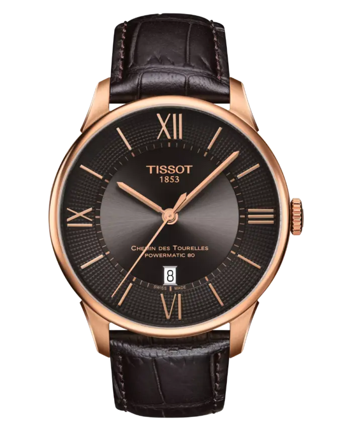 Tissot Chemin des Tourelles Powermatic 80 är en elegant automatisk herrklocka med 42 mm boett i roséguldstonat 316L rostfritt stål och brun urtavla med romerska siffror och indexmarkeringar. Den drivs av Powermatic 80-verket som ger upp till 80 timmars gångreserv och har domat safirglas med antireflex samt transparent bakboett. Utrustad med datum, brunt läderarmband och butterfly-lås. Vattentät upp till 5 ATM (50 meter).