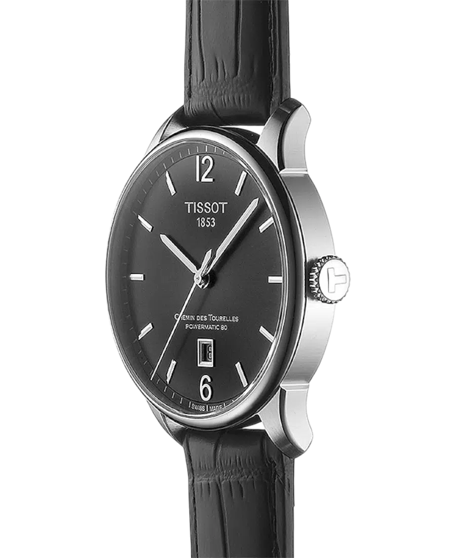 Tissot Chemin des Tourelles Powermatic 80 är en klassisk och elegant automatisk herrklocka med 42 mm boett i borstat och polerat 316L stål. Den har en grå urtavla med arabiska siffror och indexmarkeringar, kupat repskyddat safirglas och transparent bakboett som visar det schweiziska Powermatic 80-verket med upp till 80 timmars gångreserv. Klockan kommer med grått läderarmband och viklås i stål samt datumfunktion vid kl. 6 och vattenskydd på 5 ATM (50 meter).