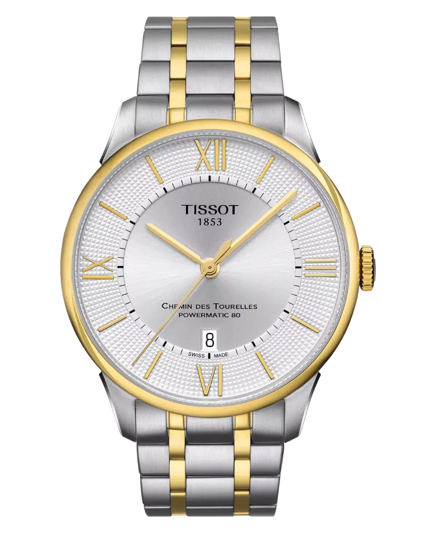 Tissot Chemin des Tourelles Powermatic 80 är en elegant och klassisk automatisk herrklocka med tvåtons boett och länk i 316L rostfritt stål med gulguld PVD. Den har en silverfärgad urtavla med romerska siffror och index, domat safirglas med antireflex och transparent bakboett. Utrustad med Powermatic 80-verket som erbjuder upp till 80 timmars gångreserv, datumvisning vid kl. 6 och butterfly-lås. Vattenskydd 5 ATM (50 meter).