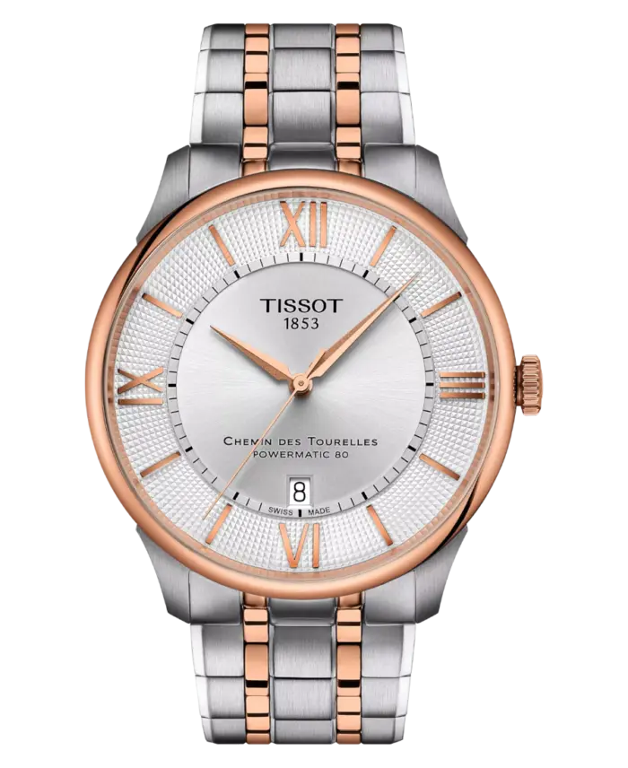 Tissot Chemin des Tourelles är en elegant automatisk herrklocka i bicolor 316L rostfritt stål med roséguld PVD, silverfärgad urtavla och en 42 mm boett. Modellen är utrustad med det automatiska Powermatic 80-verket, välvt safirglas med antireflex, datumvisning och en tvåfärgad länk. Vattentät upp till 5 ATM.