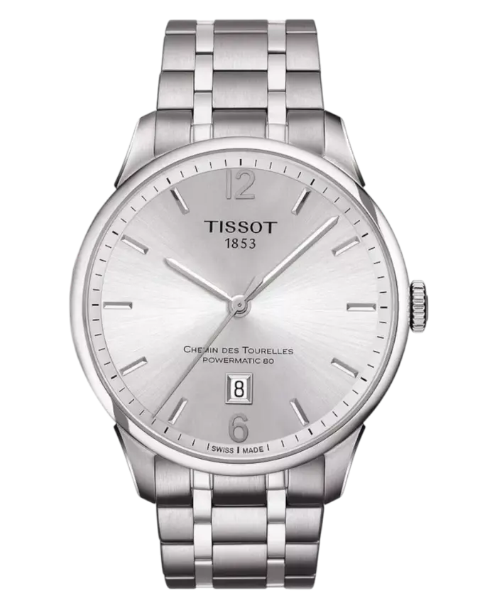 Tissot Chemin des Tourelles Powermatic 80 är en tidlös och elegant automatisk herrklocka med 42 mm boett i 316L rostfritt stål och silverfärgad urtavla med arabiska siffror och index. Den drivs av det schweiziska automatiska Powermatic 80-verket som erbjuder upp till 80 timmars gångreserv. Klockan har domat safirglas med antireflexbehandling, transparent bakboett, datumvisning och en robust stållänk med butterfly-lås. Vattentät upp till 5 ATM (50 meter).