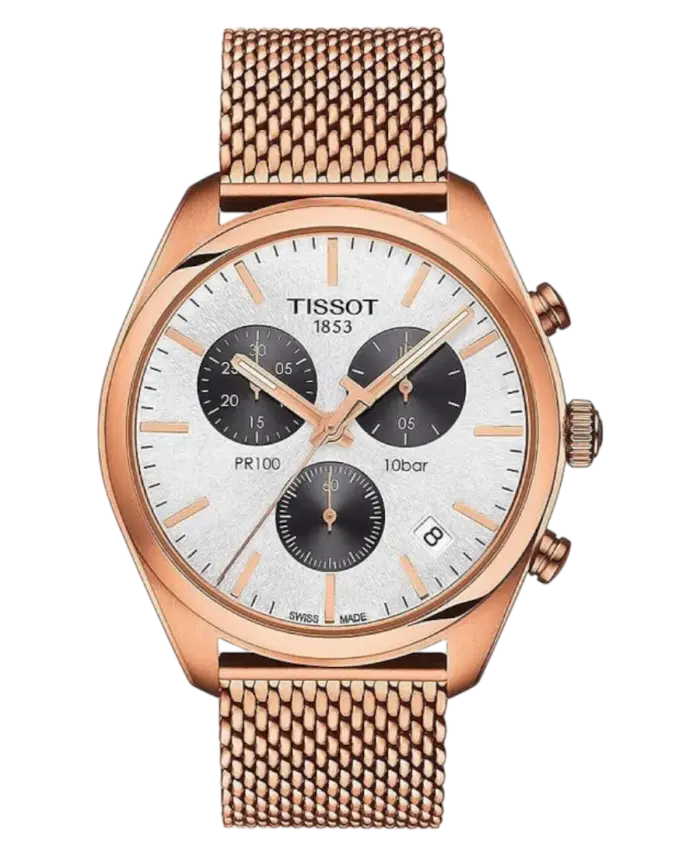En elegant Tissot PR 100 Chronograph med silverfärgad urtavla och roséguld PVD-behandlad boett och länk. Utrustad med schweiziskt kvartsverk, safirglas, kronograf och 10 ATM vattenskydd.