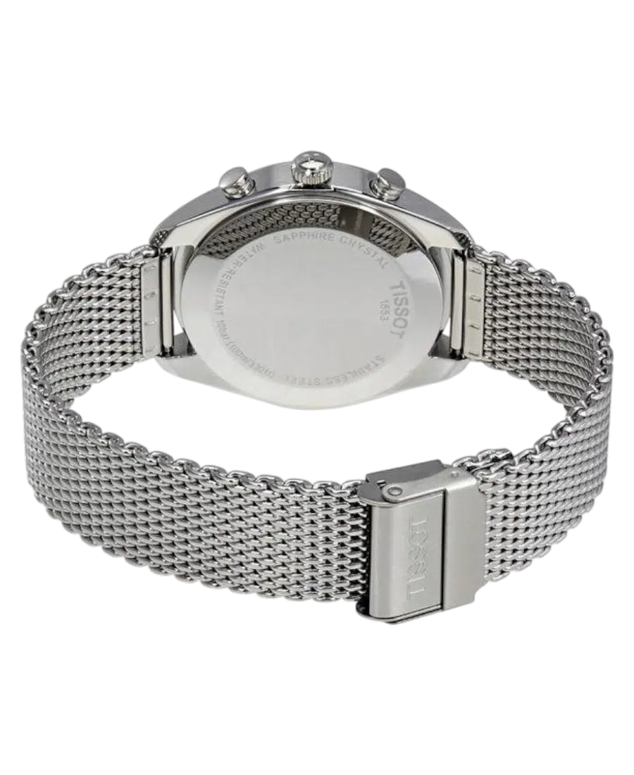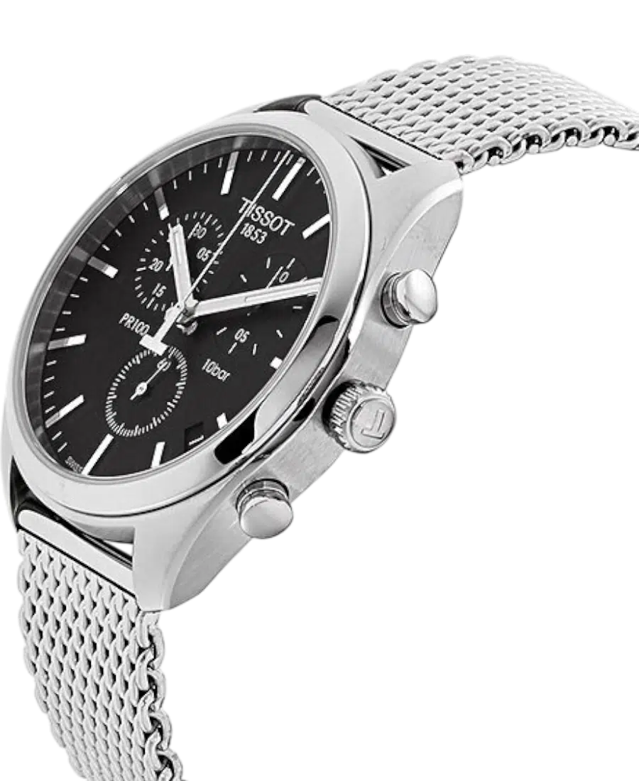 En robust och stilren Tissot PR 100 Chronograph med svart urtavla, rostfri stålboett och stållänk. Utrustad med schweiziskt kvartsverk, safirglas, kronograf och 10 ATM vattenskydd.