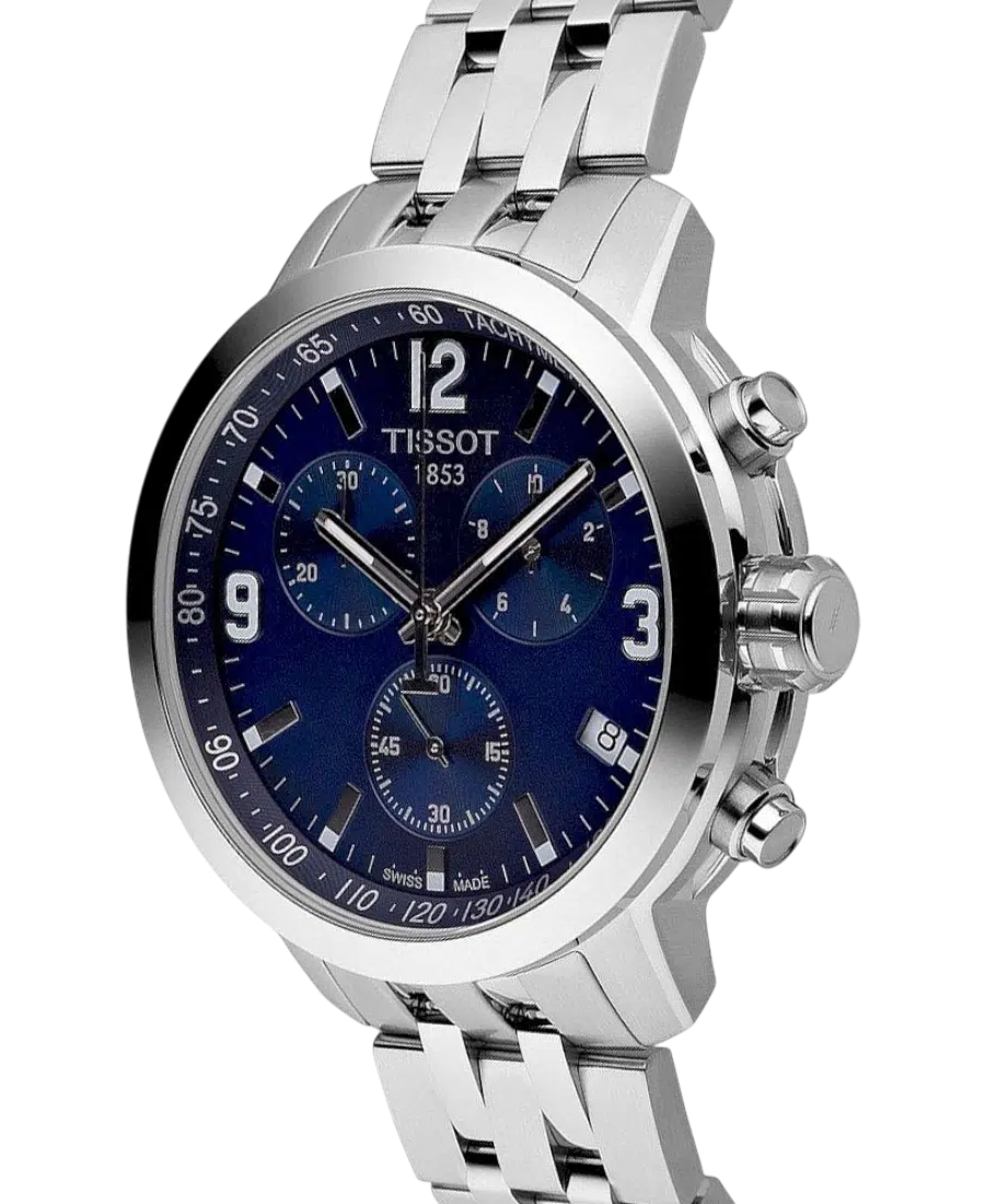 En sportig och elegant Tissot PRC 200 med blå tavla och stålarmband. Utrustad med schweiziskt kvartsverk, kronograf, datum och 20 ATM vattenskydd.