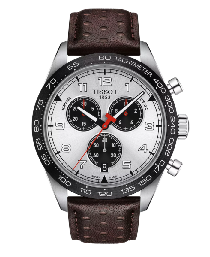 Elegant och sportig herrklocka från Tissot PRS 516 med Swiss Quartz‑urverk och kronograffunktioner. Utrustad med silver urtavla, brunt läderarmband och vattentålighet upp till 10 ATM – perfekt för både vardag och aktivitet.