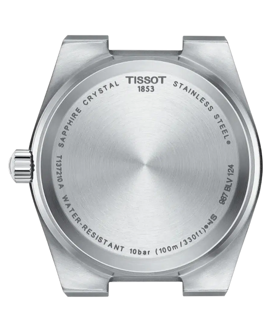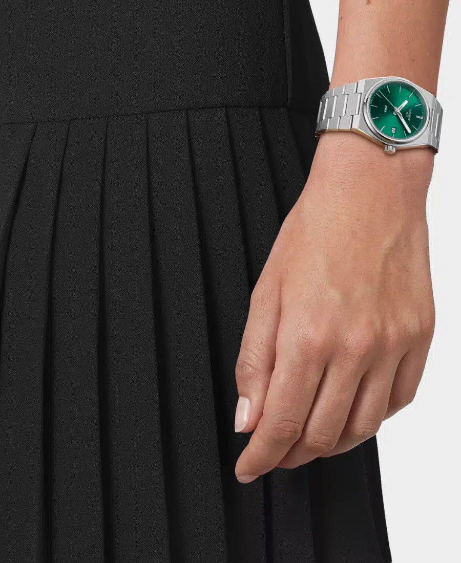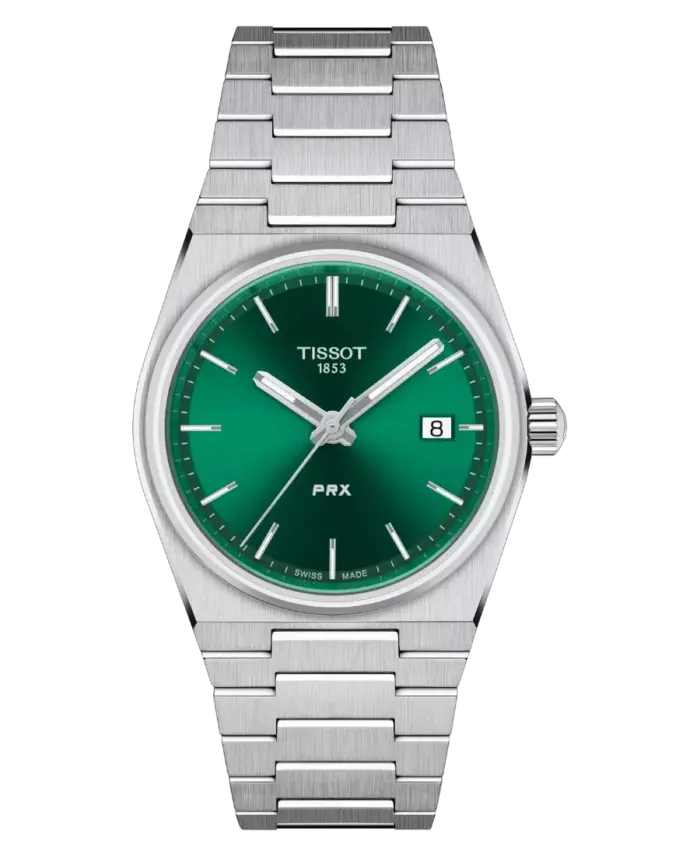 En elegant Tissot PRX dammodell med grön sunray-urtavla och stållänk. Utrustad med schweiziskt kvartsverk, datumvisning och safirglas.