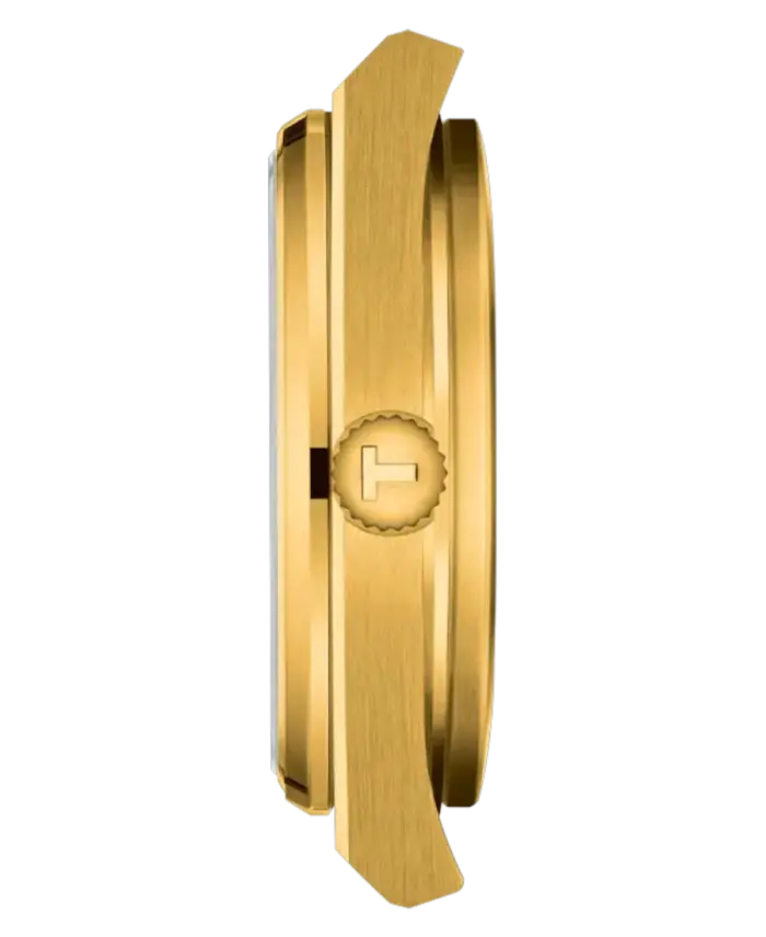 En elegant Tissot PRX 35mm i guldfärgat stål med guldfärgad urtavla. Utrustad med schweiziskt kvartsverk, datumvisning, safirglas och 10 ATM vattenskydd.