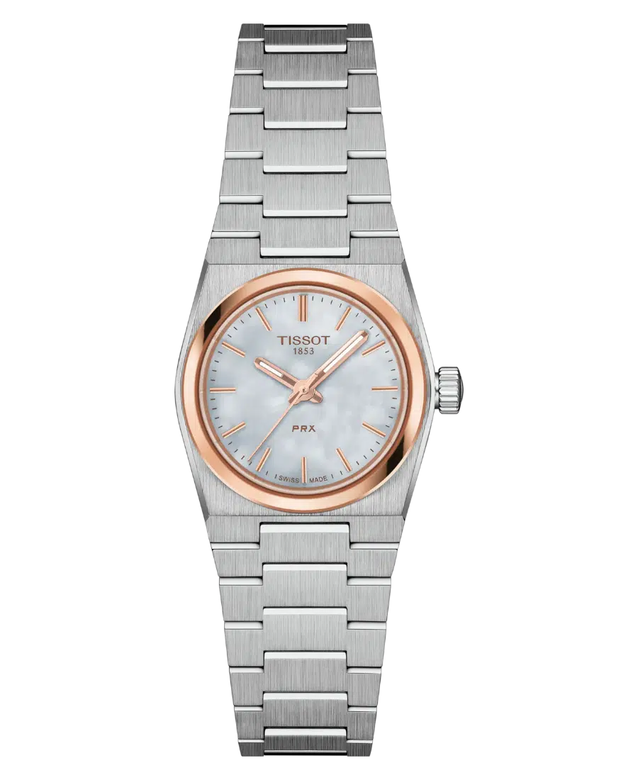 En elegant Tissot PRX 25mm med vit pärlemortavla, roséguld PVD-boett och grått stålarmband. Utrustad med schweiziskt kvartsverk med EOL-funktion, safirglas med antireflex och 10 ATM vattenskydd.