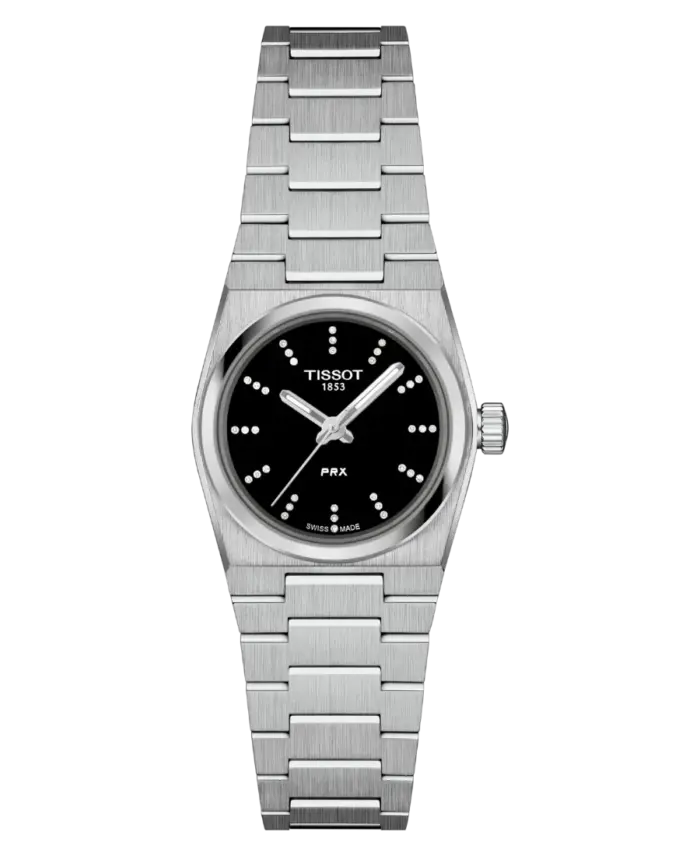 En elegant Tissot PRX med svart urtavla, diamantindex och rostfritt stålarband. Utrustad med schweiziskt kvartsverk, safirglas med antireflex och 10 ATM vattenskydd.