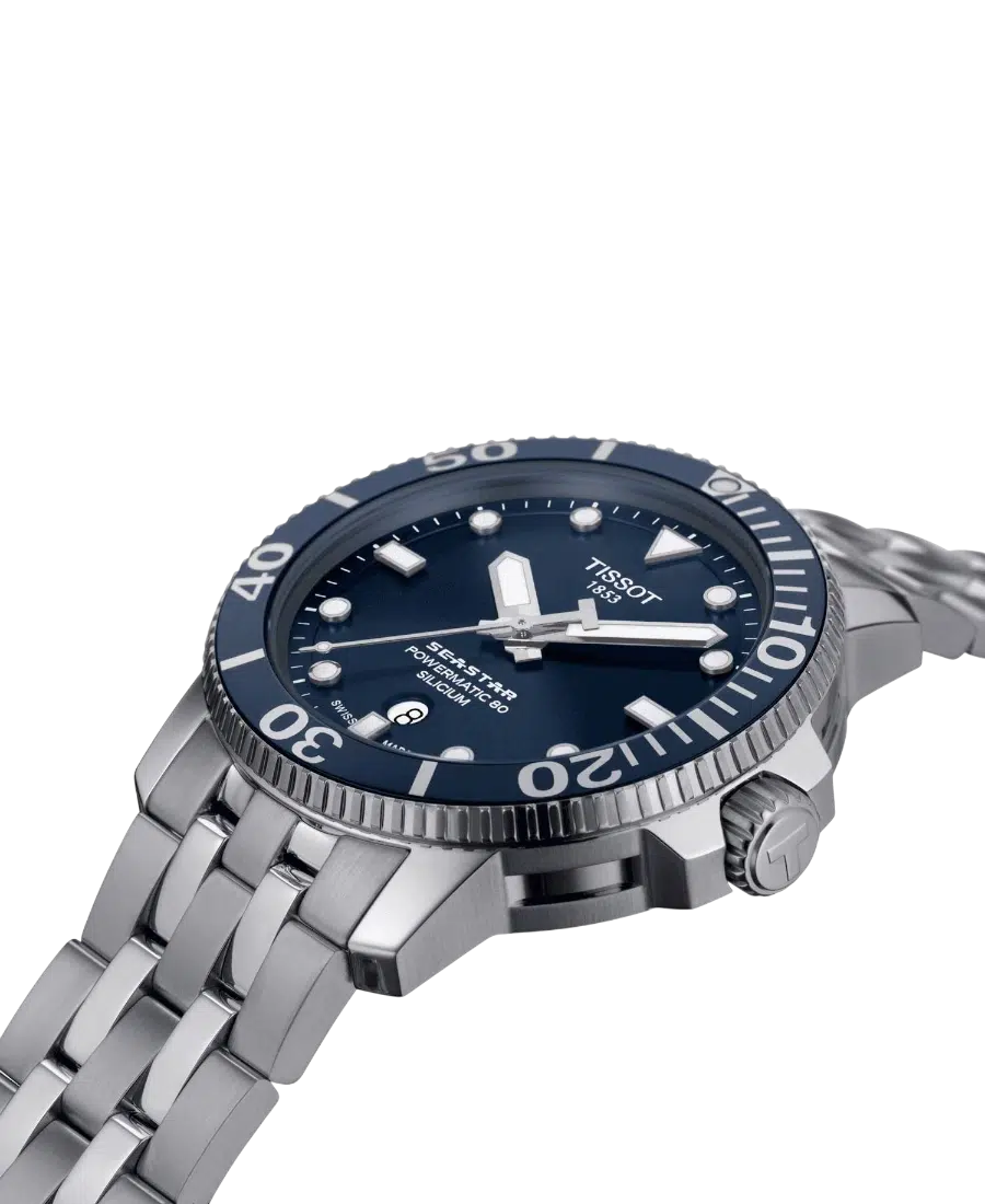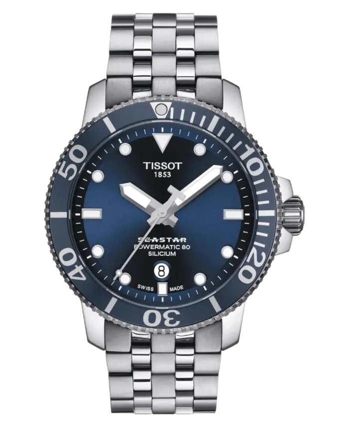 Tissot Seastar 1000 Powermatic 80 Silicium är en pålitlig och stilren automatisk dykklocka med 43 mm boett i 316L rostfritt stål och blå urtavla. Den är utrustad med Powermatic 80 Silicium-verket som erbjuder upp till 80 timmars gångreserv och förbättrad motståndskraft mot magnetism. Modellen har keramisk envägs vridring, skruvad krona och bakboett, reptåligt safirglas med antireflex och är vattentät upp till 30 ATM (300 meter). Perfekt för både dykning och vardagsanvändning.