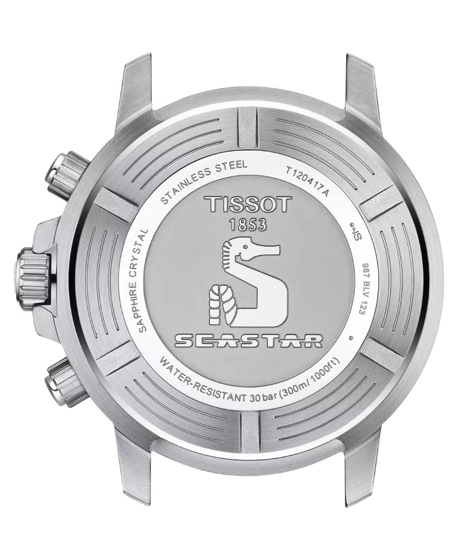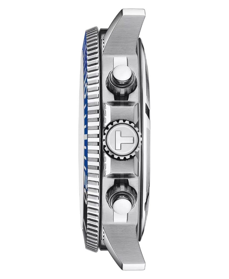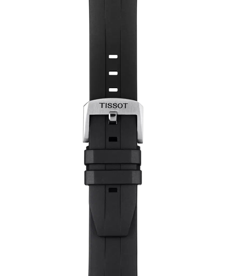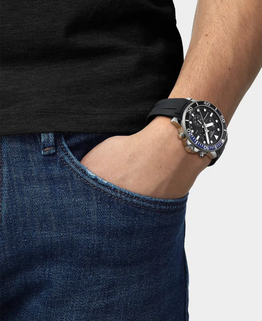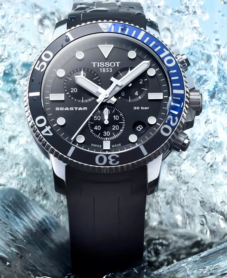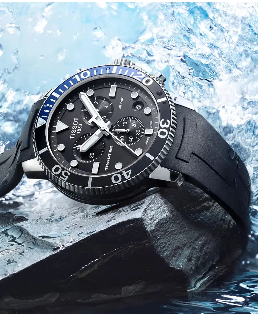 En sportig Tissot Seastar 1000 med svart urtavla, gummiband och 300 m vattenskydd. Utrustad med kronograf, datum och safirglas.