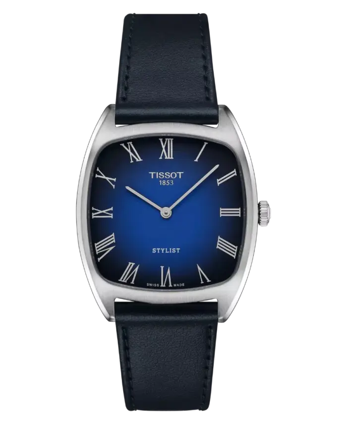En stilren Tissot Stylist med fyrkantig 32 mm boett, blå urtavla med romerska index och blått läderarmband. Utrustad med safirglas och kvartsurverk, klassificerad till 5 ATM.
