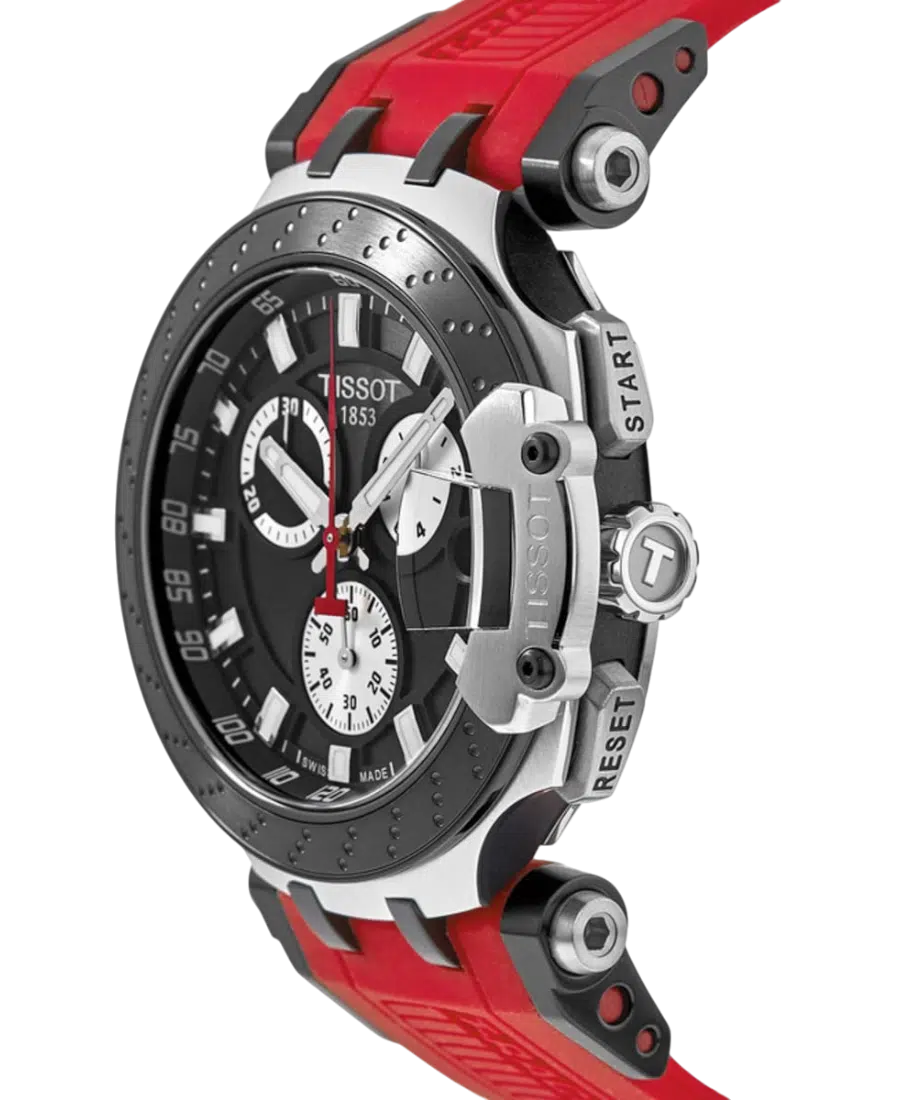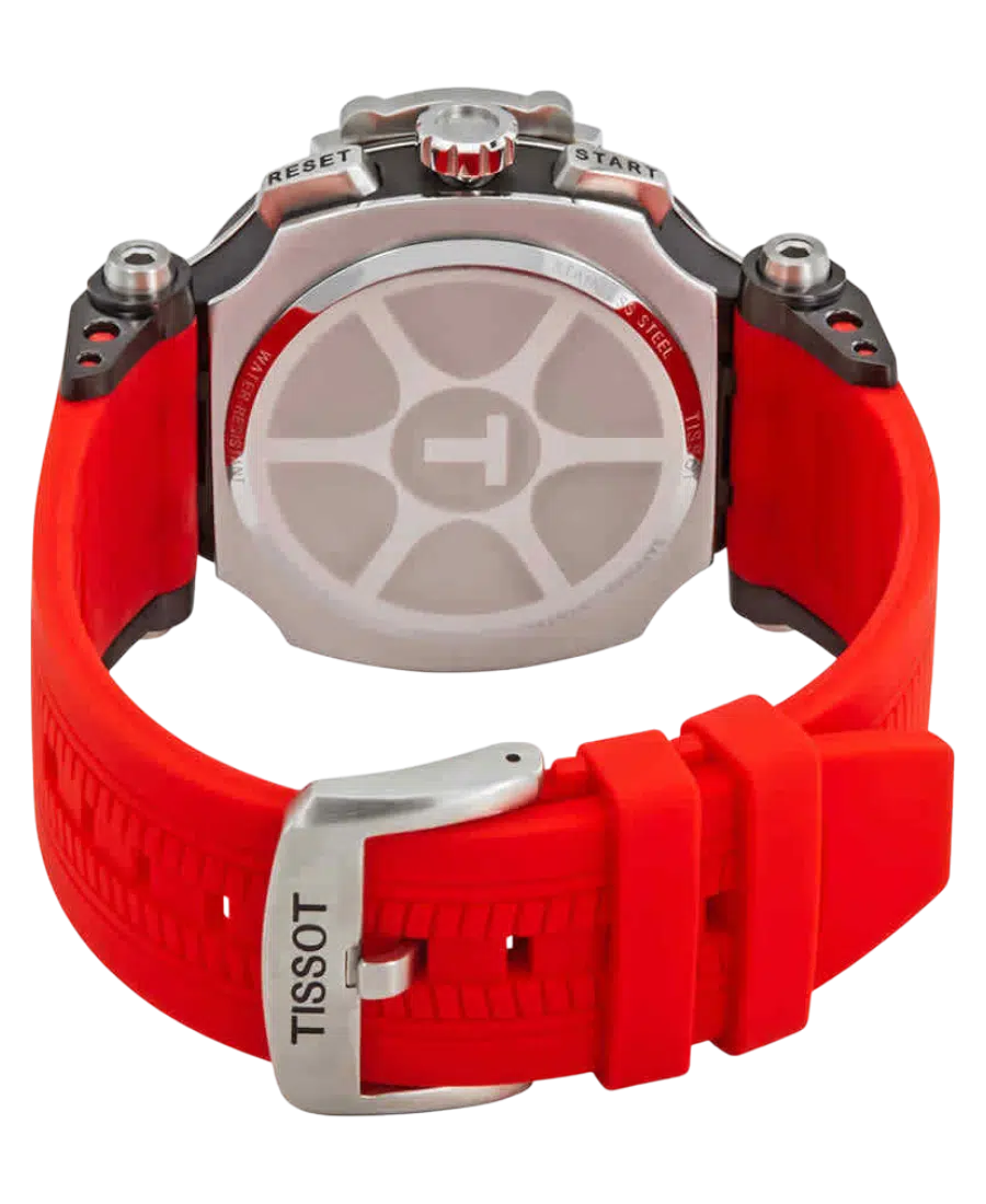 En sportig Tissot T-Race Chronograph med svart urtavla, svart PVD-boett och rött gummiband. Utrustad med kronograf, datum, tachymeter och safirglas.