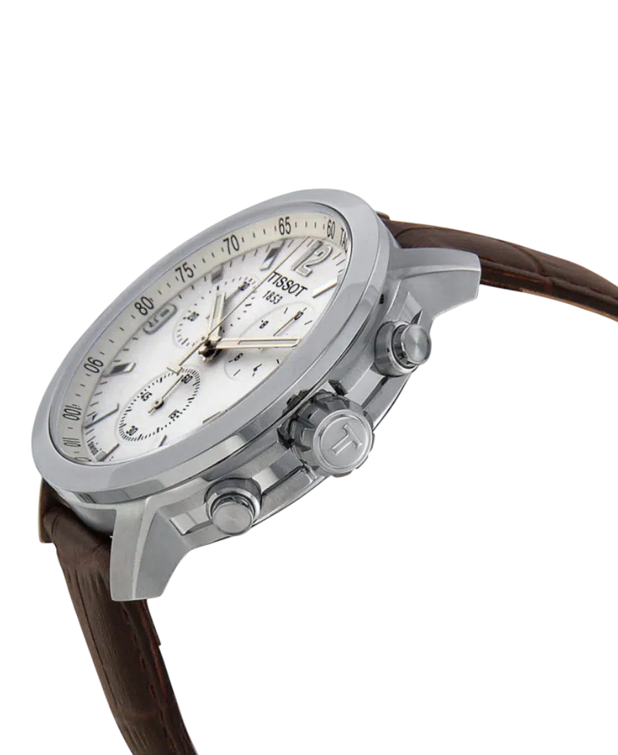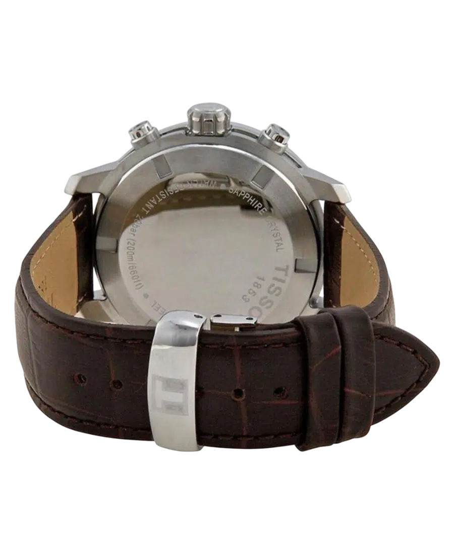 En stilren Tissot T-Sport med vit urtavla och brunt läderarmband. Utrustad med schweiziskt kvartsverk, kronograf, datum och 20 ATM vattenskydd.
