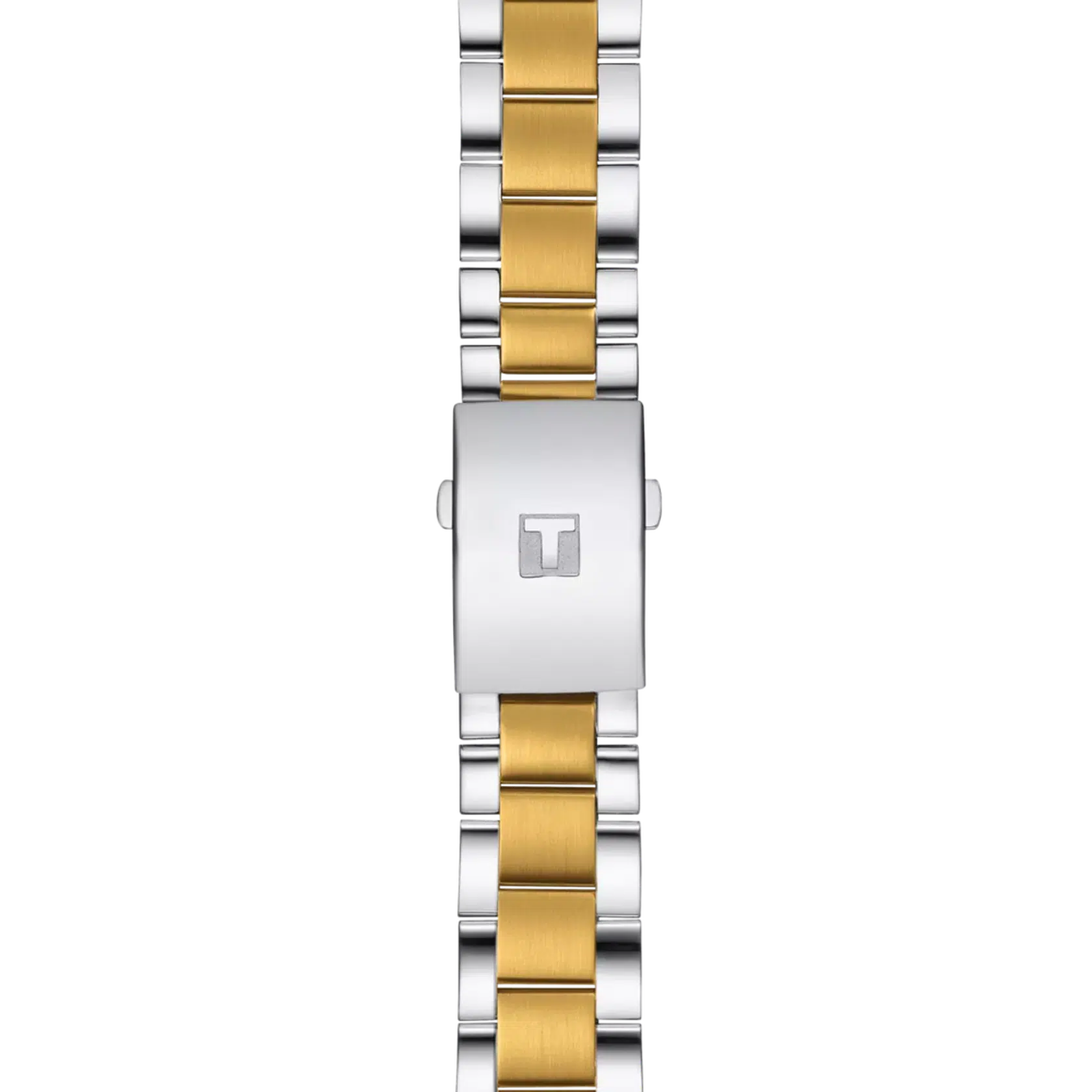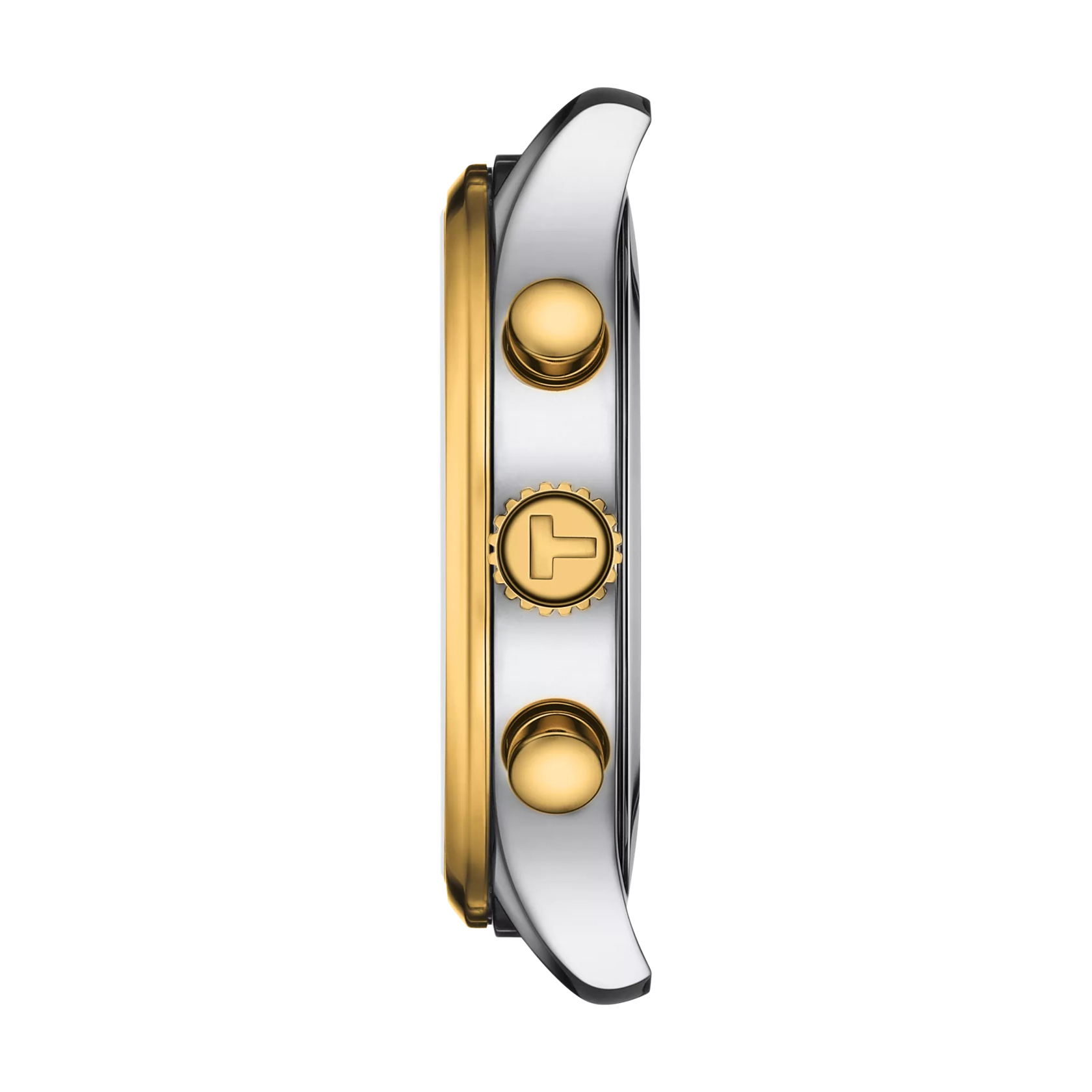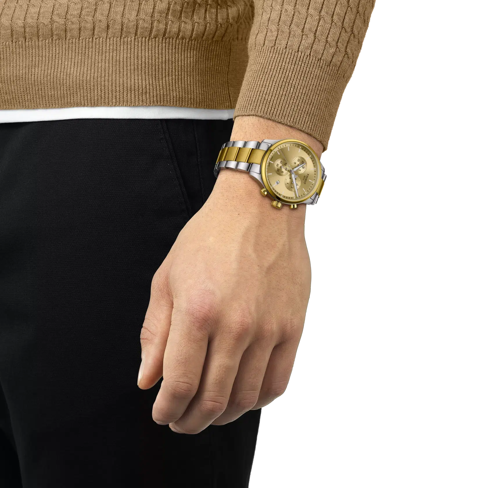 Tissot Chrono XL Classic är en sportig och elegant kronograf med champagnefärgad urtavla och tvåfärgat stålarmband, perfekt för både vardag och formella tillfällen.