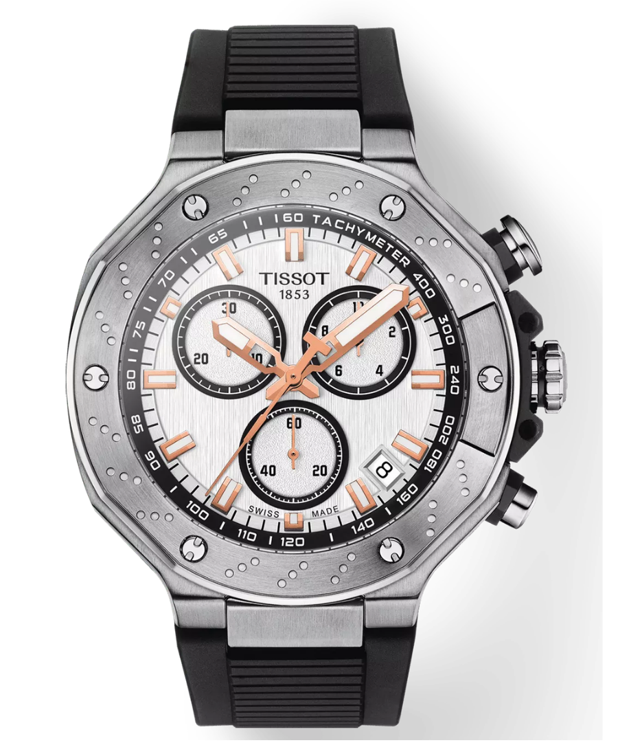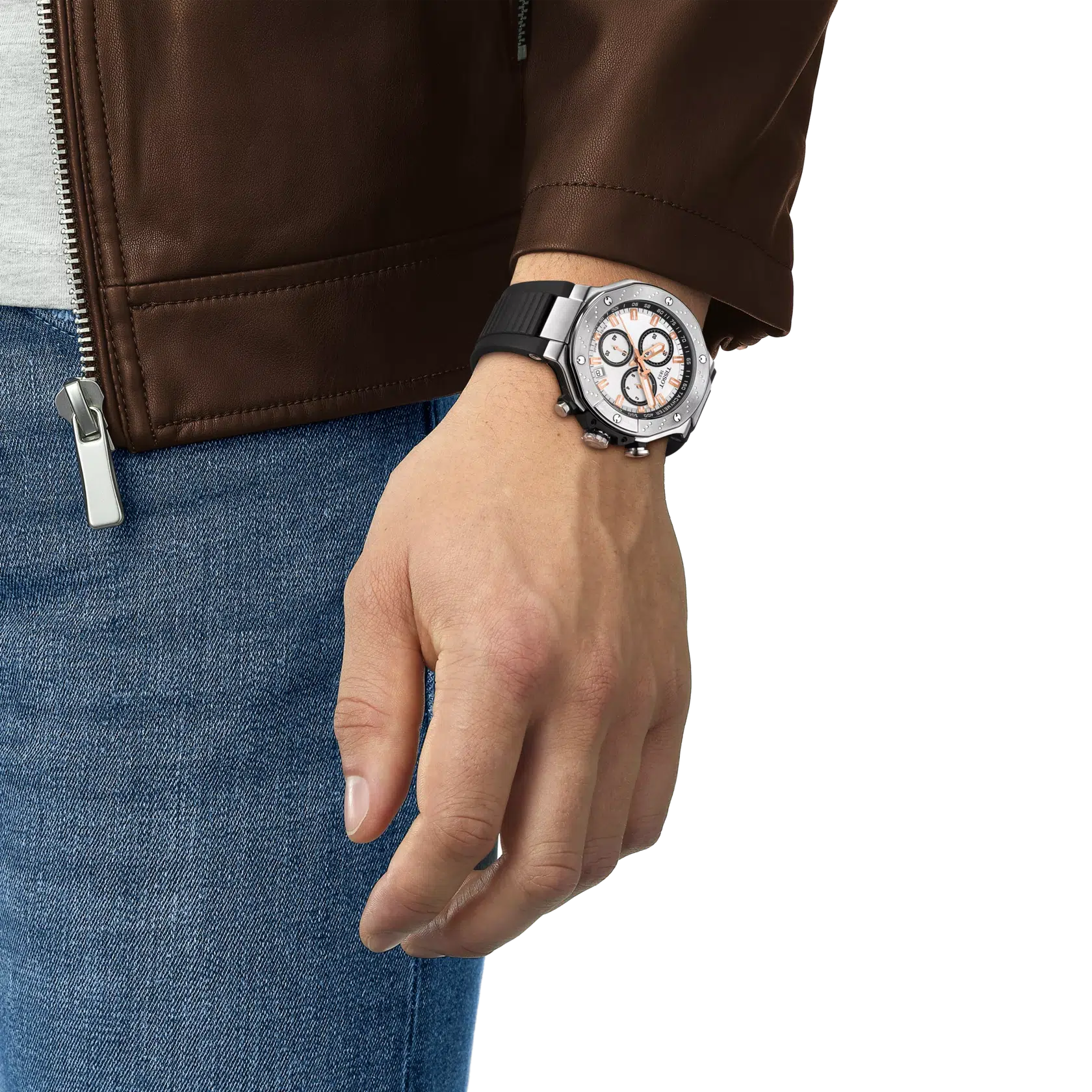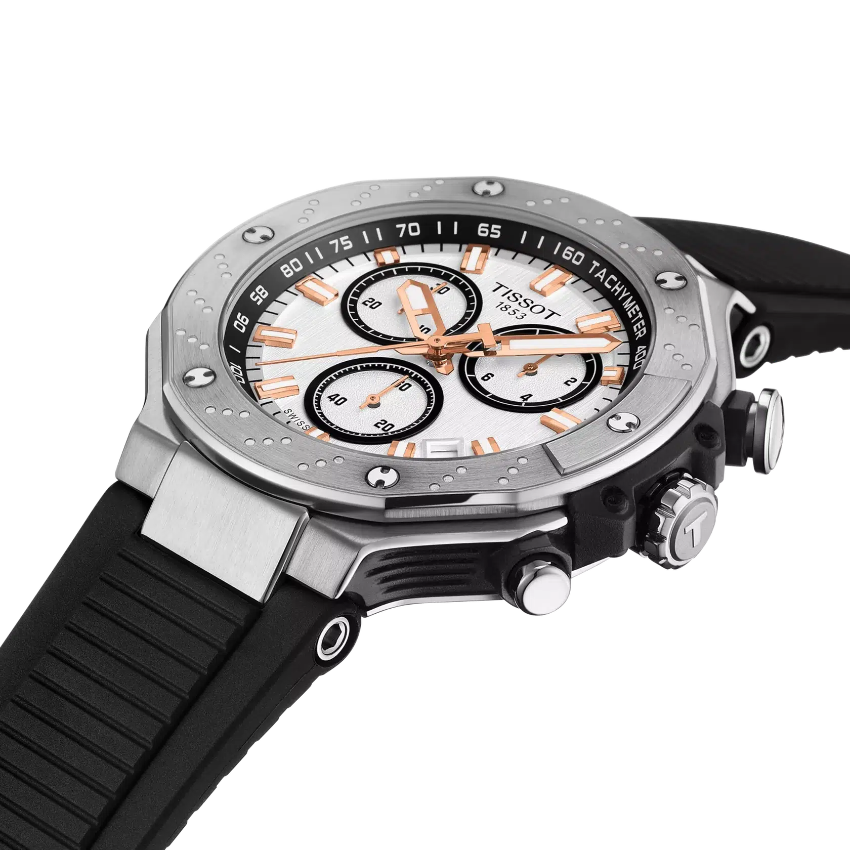 Tissot T-Race är en sportig kronograf inspirerad av motorcykelracing med vit urtavla och svart gummiband, utrustad med exakt schweizisk quartz-urverk.